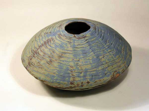 This 30cm in diameter, Earthenware coil pot was inspired by the colour and shape of a tortoiseshell, and it has been specifically designed as a vase for various overhanging flowers or plants. With this piece, Gemma wanted to move away from the traditional upright vase design and explore how the flowers could be displayed differently.