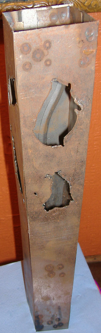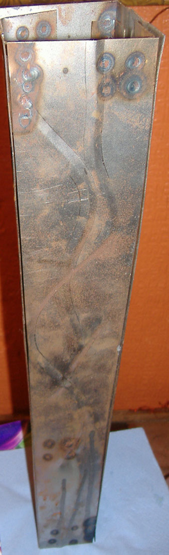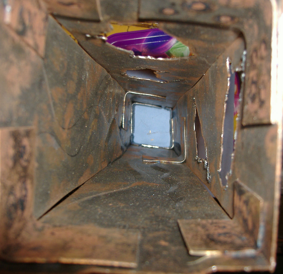 This metal candle display vase works in a similar way to the floating candle bowl. By using a plasma cutter, various shapes were formed in two sides of the vase to create different shapes of light on the surrounding walls when a candle is displayed inside. The entire piece is approximately 40cm tall, and makes a wonderfully creative decoration for any modern room.